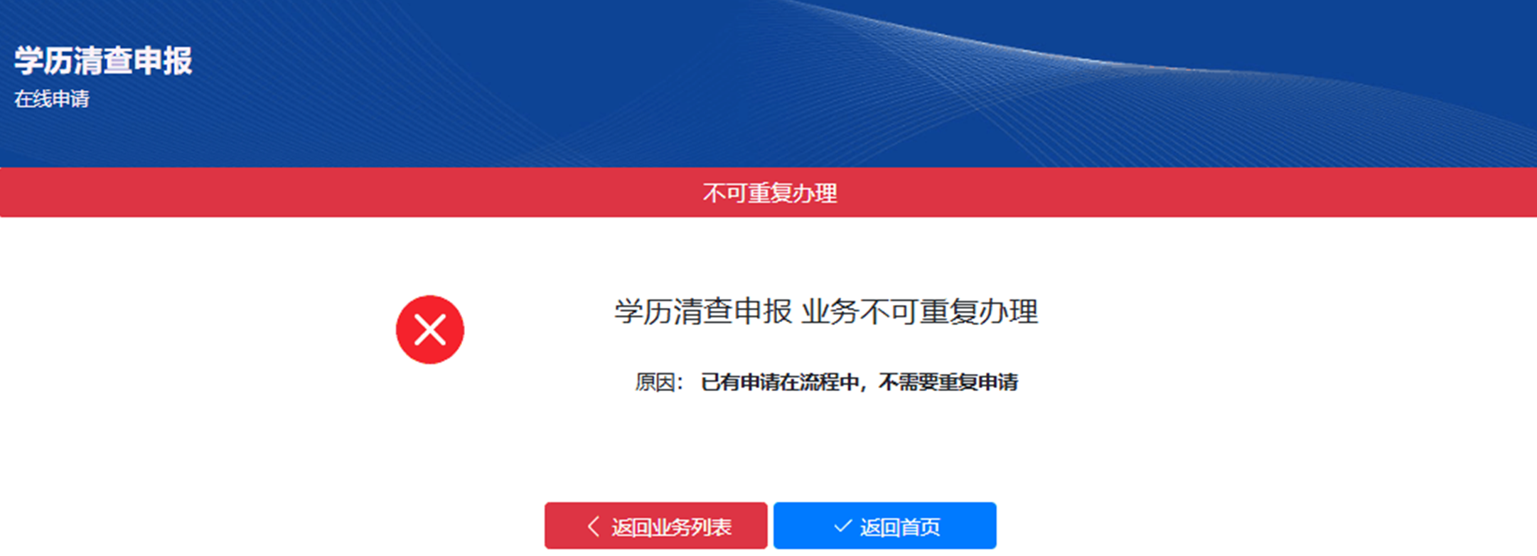 3.学历清查材料修改:点击“学历清查申报”时若提示已有申请在流程中,则不能再重复提交(如下图所示)。若申请人要对已提交材料进行修改,则可登录“综合服务平台-用户中心”,在“我的事项”中找到已申报的学历清查项目,点击后方“撤回修改”按钮进行修改,每个申请人有且仅有1次修改机会(参见3月30日发布的公众号)。